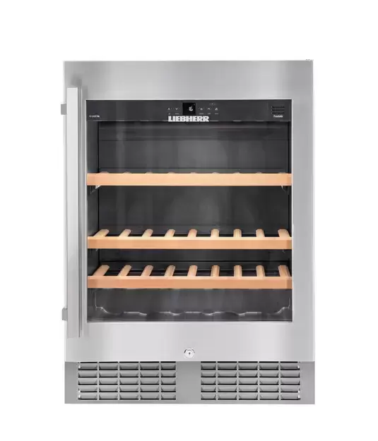 Винный шкаф Liebherr UWKes 1752 — модель австрийского производства высотой 81 см и вместимостью 46 бутылок для размещения под столешницей. Фасад изготовлен из нержавеющей стали и дополнен удобной вертикальной ручкой. |
